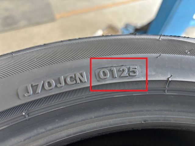 上の写真を例とすると、タイヤ側面に「0125」(上の写真の赤枠部分)と記載されていますので、「2025年の1週目」に製造されたタイヤを意味します。したがって、製造から3~4年を過ぎる「2028~2029年頃」には、経年劣化(ゴムの硬化)により走行性能の低下を予測できるのです。